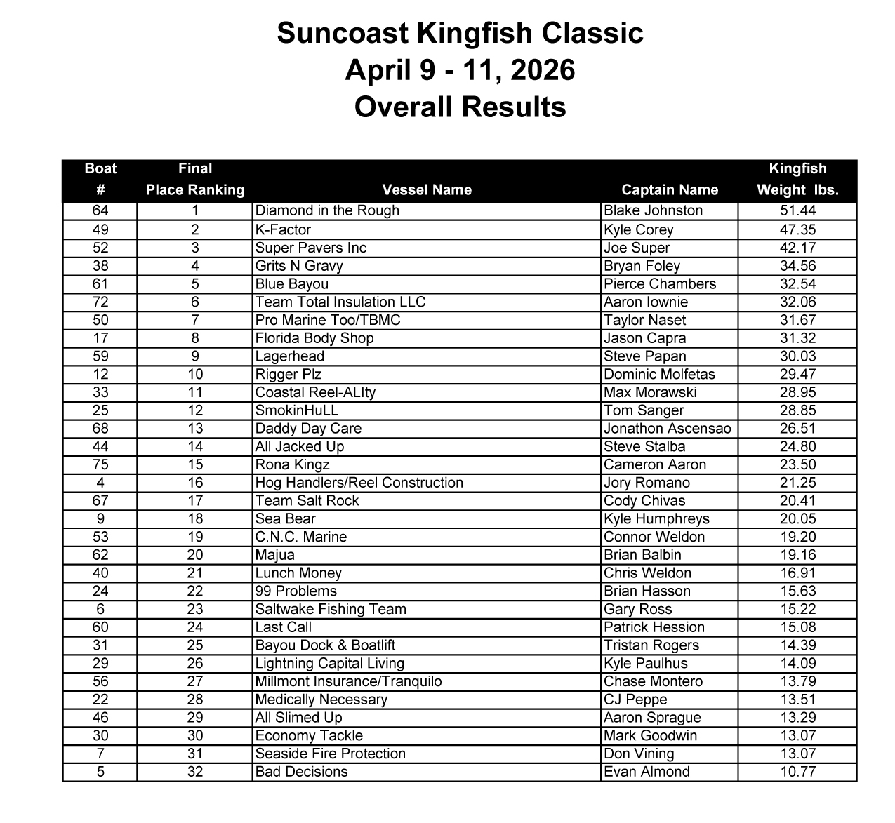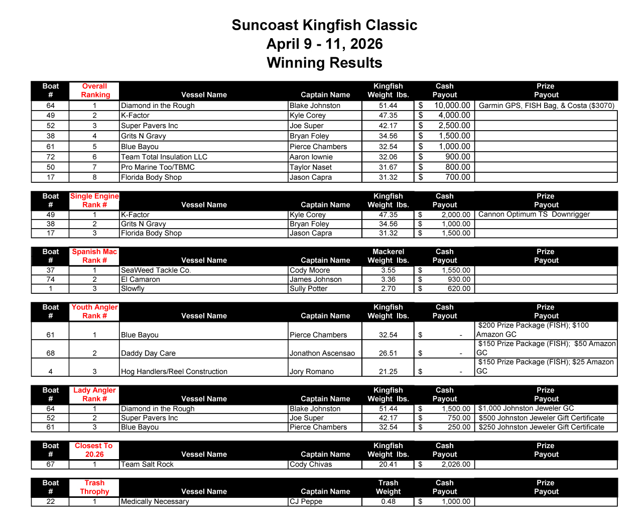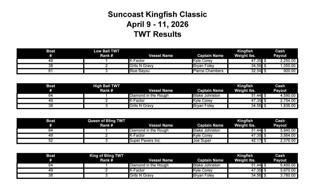 33rd Annual Suncoast Kingfish Classic Official Winners
