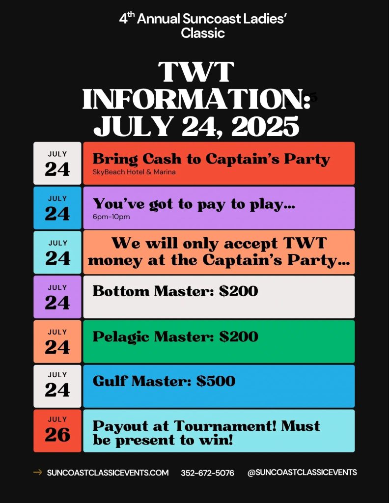 The single heaviest fish weighed in for either BOTTOM or PELAGIC categories at the 4th Annual Suncoast Ladies’ Classic will win…